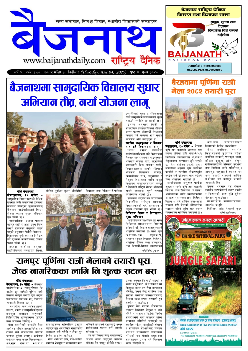 Homeस्थानीयबैजनाथ दैनिक १८ मंसिर स्थानीय बैजनाथ दैनिक १८ मंसिर By बैजनाथ सम्पादक December 4, 2025 0 199 Share FacebookTwitterPinterestWhatsApp Share FacebookTwitterPinterestWhatsApp Previous articleसमावेशिका पुर्वविद्यार्थी बुढालाई एमबिबीएस अध्ययनका लागि भव्य सम्मानNext articleतेस्रो प्याब्सन कोहलपुर रनिङ शिल्ड खेलकुद प्रतियोगिता जारी बैजनाथ सम्पादकhttps://baijanathdaily.com RELATED ARTICLES बिबिध बाँके–३ मा नेकपा उम्मेदवार दिपक जि एमको उत्साहपूर्ण घरदैलो March 1, 2026 राष्ट्रिय योग्य उम्मेदवार छान्ने अवसर नगुमाउन कोइरालाको आग्रह February 28, 2026 राष्ट्रिय बाँके–३ मा नेकपाको घरदैलो, ‘तारा’मा मतदान गर्न श्रेष्ठको अपिल February 28, 2026 LEAVE A REPLY Cancel reply Comment: Please enter your comment! Name:* Please enter your name here Email:* You have entered an incorrect email address! Please enter your email address here Website: Save my name, email, and website in this browser for the next time I comment. - Advertisment - Most Popular बाँके निर्वाचन क्षेत्र नम्बर १ मा एक लाख २४ हजार ७२७ जना मतदाता March 4, 2026 नेपाल तरुण दलको नेतृत्वमा कोहलपुर क्षेत्रमा कोण सभा सम्पन्न, नेपाली काङ्ग्रेस क्षेत्र नं. १ का कार्यकर्ता तथा समर्थकको उत्साहजनक सहभागिता March 2, 2026 बाँके–३ मा नेकपा उम्मेदवार दिपक जि एमको उत्साहपूर्ण घरदैलो March 1, 2026 प्रगतिशील लोकतान्त्रिक पार्टीका उम्मेदवार कृष्ण केसीप्रति बढ्दो जनसमर्थन February 28, 2026 Load more Recent Comments Deepak budha on निरन्तर जनसेवामा वडा अध्यक्ष:खड्का Sher on चुनावी मैदानमा एक्लै साईकलमा चन्द्रबिर कामी yogen ghimire on कुशेमा विकास माग्दै मन्त्रालयमा डेलिकेशन