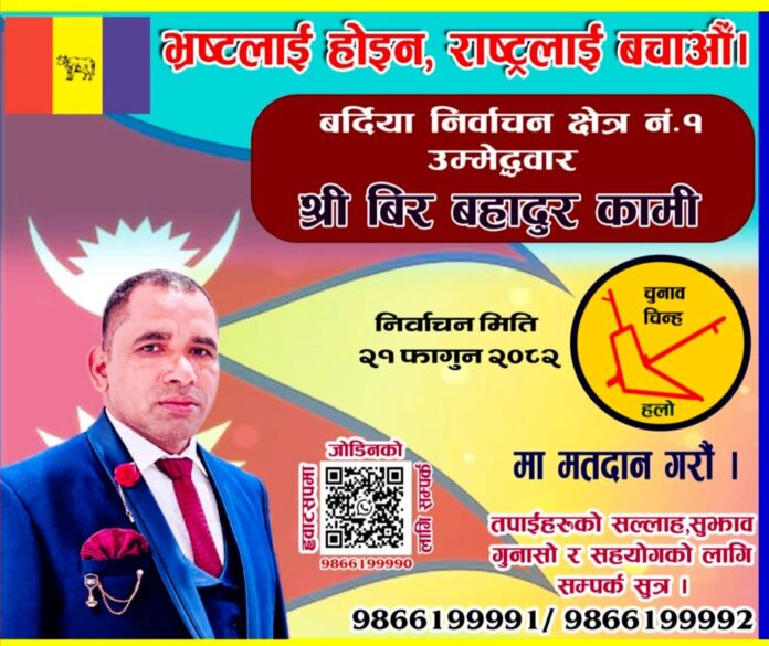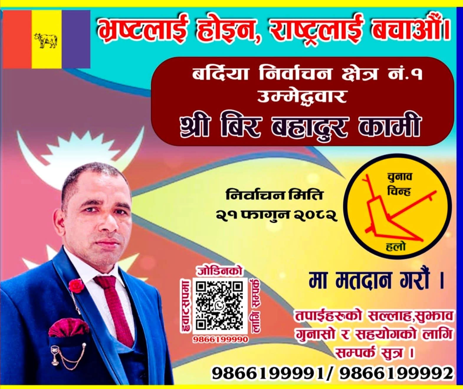 बर्दिया : बर्दिया जिल्लाको क्षेत्र नं. १ बाट राष्ट्रिय प्रजातन्त्र पार्टी (राप्रपा) को तर्फबाट प्रतिनिधि सभा निर्वाचनका लागि दलित समुदायका युवा समाजसेवी वीर बहादुर कामीले आज मनोनयन दर्ता गर्ने भएका छन्।