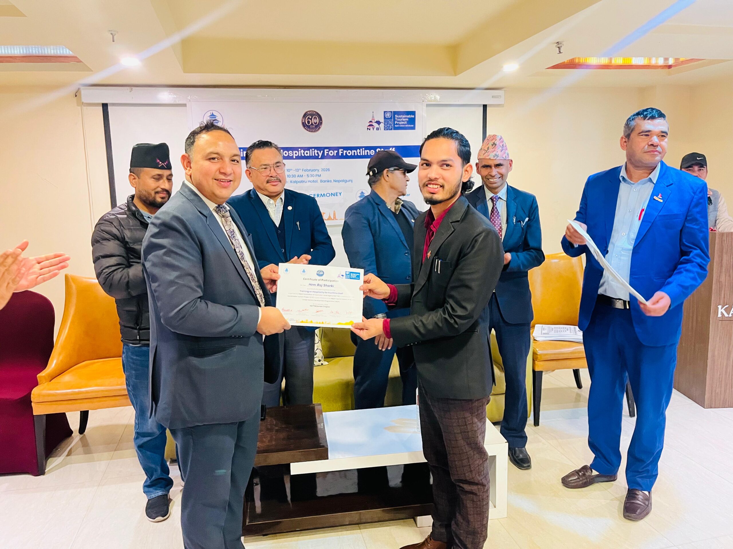 नेपालगन्ज : होटल, रेस्टुरेन्ट, ट्राभल तथा मनोरञ्जन क्षेत्रमा कार्यरत फ्रन्टलाइन कर्मचारीहरूको सेवा दक्षता अभिवृद्धि गर्ने उद्देश्यसहित नाट्टा बाँके च्याप्टरले आयोजना गरेको हस्पिटालिटी (आतिथ्य) तालिम नेपालगन्जमा सम्पन्न भएको छ ।