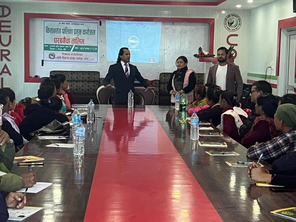 बाँके, बैजनाथ ।‘घर बगैंचा विकास आत्मनिर्भर प्रयास’ भन्ने मूल नारासहित देउराली कृषि सहकारी संस्था लि.को सभाहलमा शुक्रबारदेखि किसानसँग पालिका प्रमुख कार्यक्रमअन्तर्गत घर बगैंचा तालीम दुईदिने रूपमा सुरु भएको छ।