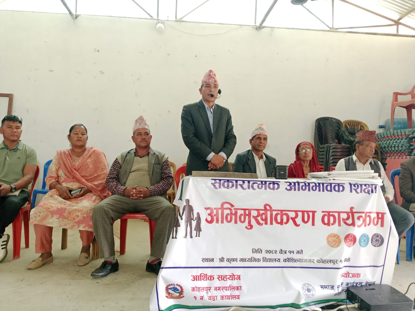समाज सुधार कार्यक्रम नेपाल, कोहलपुरको आयोजना तथा कोहलपुर नगरपालिका वडा नं. १ को आर्थिक सहयोगमा सञ्चालन गरिएको उक्त कार्यक्रम बालबालिकाको समग्र विकासमा अभिभावकको भूमिका सुदृढ बनाउने उद्देश्यका साथ आयोजना गरिएको हो ।
