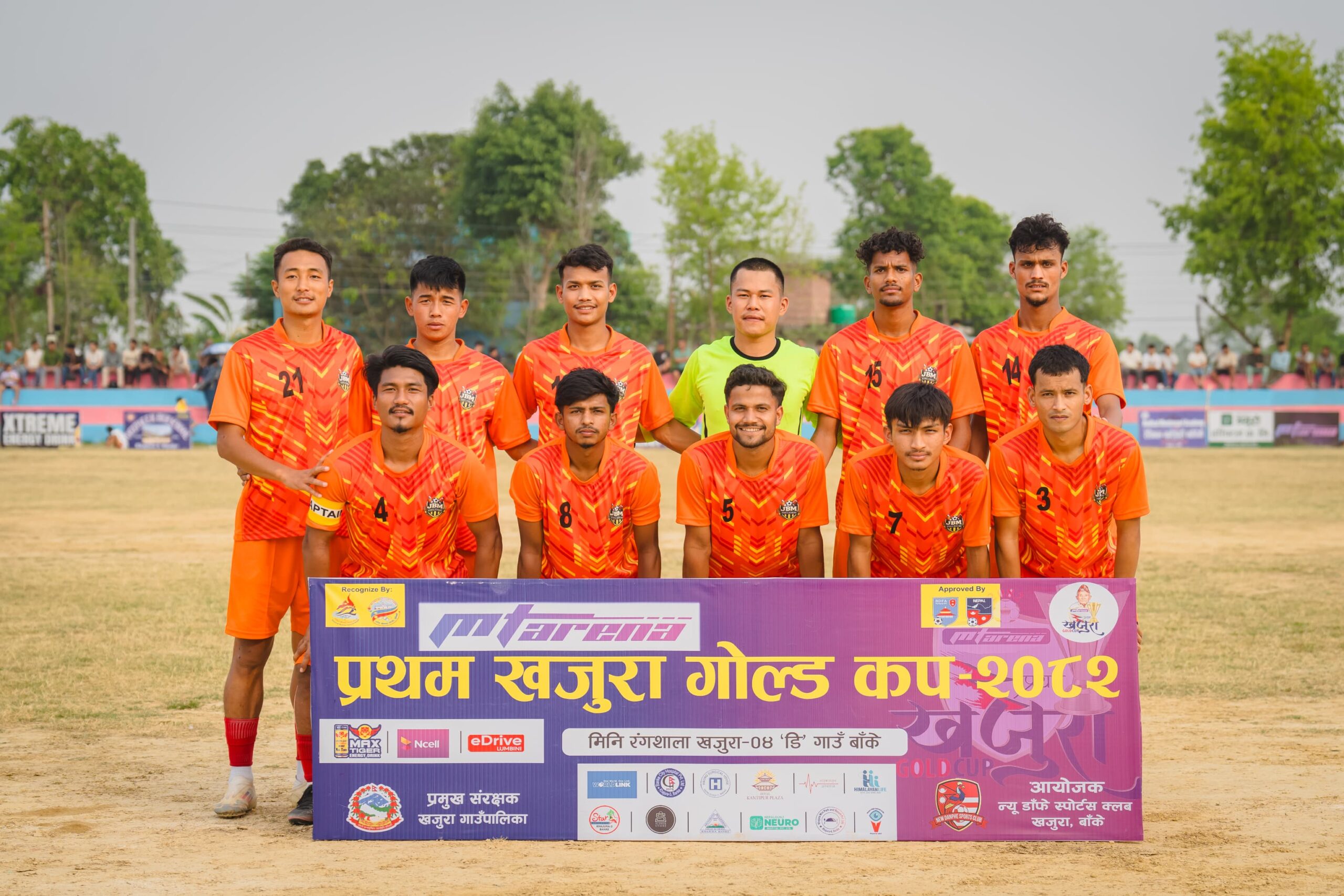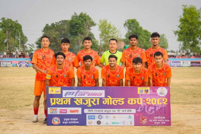 बाँके, बैशाख ४ गते । एमटि एरिना प्रथम खजुरा गोल्डकप फुटबल प्रतियोगिताको फाइनलमा जेबिएम फुटबल एकेडेमी लखनउ, भारत प्रवेश गरेको छ । खजुरा –४ डि गाउँस्थित मिनी रंगशालामा शुक्रवार भएको पहिलो सेमिफाइनलमा जेबिएमले गोर्खा ब्वाइज स्पोट्र्स क्लव बुटवललाई १ का विरुद्ध ३ गोलको अन्तरले पराजित गर्दै फाइनल प्रवेश गरेको हो । न्यू डाँफे स्पोर्टस क्लवको आयोजनामा खजुरामा जारी प्रतियोगितामा जेबिएनका जर्सी नम्बर ७ का निखिल तामाङले खेलको १२ औ मिनेटमा टिमको लागि पहिलो गोल गर्न सफल बने । यसैगरी जेबिएनकै ९ नम्बर जर्सिका सुरज भण्डारीले ४३ औ मिनेटमा टोलीका लागि दोस्रो गोल गरे । भने जर्सी नम्बर १२ का उमेश दर्लामीले ६० औ मिनेटमा तेस्रो गोल गरे । गोर्खाका जर्सी नम्बर १५ का सुजन थारुले सान्त्वना गोल गरे । दोस्रो हाफको सुरुमै कप्तान सुजन मगर रातो कार्ड पाएपछि १० खेलाडीमा सीमित जेबिएनले सम्हालिएर खेल्दै अग्रता जोगाउन सफल भयो । गोर्खाका जर्सी नम्बर २१ का उमेश थापा पनि खेलको अन्त्यतिर रातो कार्ड पाएका थिए । जेबिएमका गोलरक्षक उमेश कुमार प्लेयर अफ द म्याच घोषित भए । गोलरक्षक उमेशले नगद १० हजार सहित ट्रफि, मेडल प्राप्त गरे । यसैगरी दोस्रो सेमिफाइनल खेल शनिबार फोर ब्रदर्श एफसी र नाईजेरियन जोन क्लवबिच हुनेछ । प्रतियोगिताको फाईनल आइतबार हुने आयोजक न्यू डाँफे स्पोर्टस क्लवका अध्यक्ष बालाराम खत्रीले जानकारी दिनुभयो । न्यू डाँफे स्पोर्टस् क्लबको आयोजनामा सुरु भएको प्रतियोगितामा गोर्खा ब्वाइज स्पोर्टस् क्लब बुटवल, संकटा एफसी, न्यू डाँफे स्पोर्टस् क्लब, जेभिएम फूटबल एकेडेमी लखनउ, काक्रेविहार क्लब सुर्खेत, फोर ब्रदर्श एफसी नवलपरासी, एपीएफ काठमाडौं र नाइजेरियन जोन क्लब नाइजेरिया गरी ८ टोलीको सहभागिता थियो । प्रतियोगिताको बिजेतालाई सात लाख रुपियाँ र द्वितीयलाई चार लाख रुपियाँ नगद पुरस्कार प्रदान गरिनेछ । प्रतियोगितामा करिव ६० लाख बढि खर्च हुने अनुमान गरिएको छ । विजेता पुरस्कार खजुराबासी हाल अमेरिका निवासी लिलबहादुर थापाको सौजन्यमा प्रदान गरिनेछ । यस्तै विधागततर्फ उत्कृष्ठ खेलाडीलाई नगद सहित ट्रफी, मेडल र प्रमाणपत्र प्रदान गरिनेछ । गोल्डकपलाई एमटी एरिनाले टाईटल स्पोन्सर गरेको छ । प्रतियोगितालाई एनसेल, म्याक्स टाइगर लगाएतले सहायता गरेका छन । प्रतियोगितालाई सम्पन्न गराउन गाउँका स्थानियले स्पुर्त रुपमा आर्थिक देखि भौतिक रुपमै लागेर सहयोग गरिरहेको क्लबका उपाध्यक्ष दान बहादुर गुरुङले बताए । शुक्रबार सन्चालन भएको खेल हेर्न र खेलाडीलाई होसला प्रदान गर्न चर्चित गायक बर्दि पंगेनी पुगेका थिए । गायक पंगेनीले अहिले चर्चामा रहेको झ्याप्पै आइन मगर्नि बोलको गित प्रस्तुत गरेक